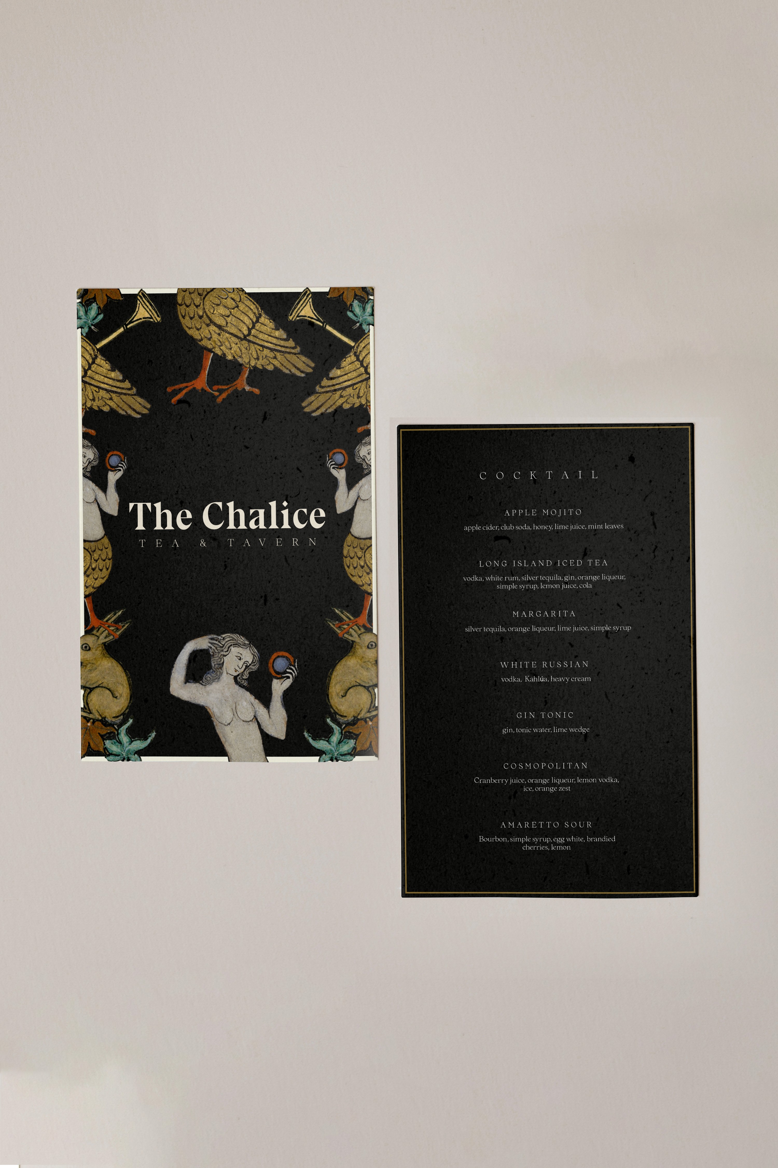 The Chalice is a modern tea bar and restaurant that blends sleek, contemporary design with rich medieval inspiration. The brand’s identity centers around a streamlined chalice icon, a modern nod to medieval glassware that ties the concept together. It’s a bold blend of past and present, designed to feel both quaint and elevated.